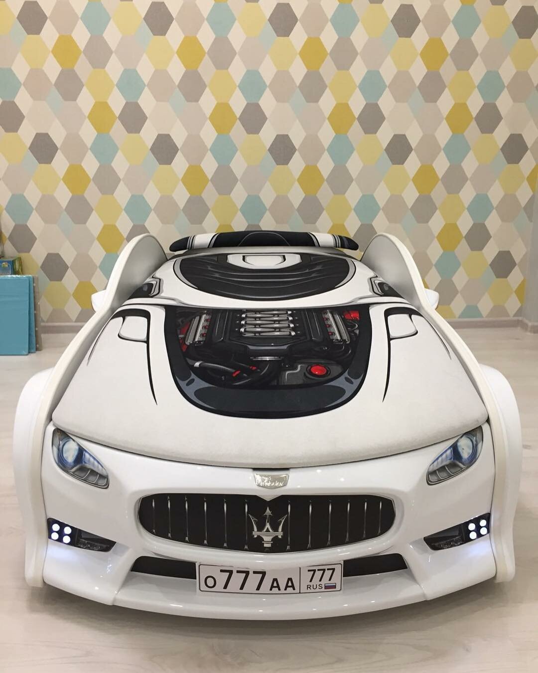Кроватка Futuka Kids кровать-машина Neo Мазератти белый цвет белый c подсветкой фар и дна, спойлером, матрас в дизайне "sport"