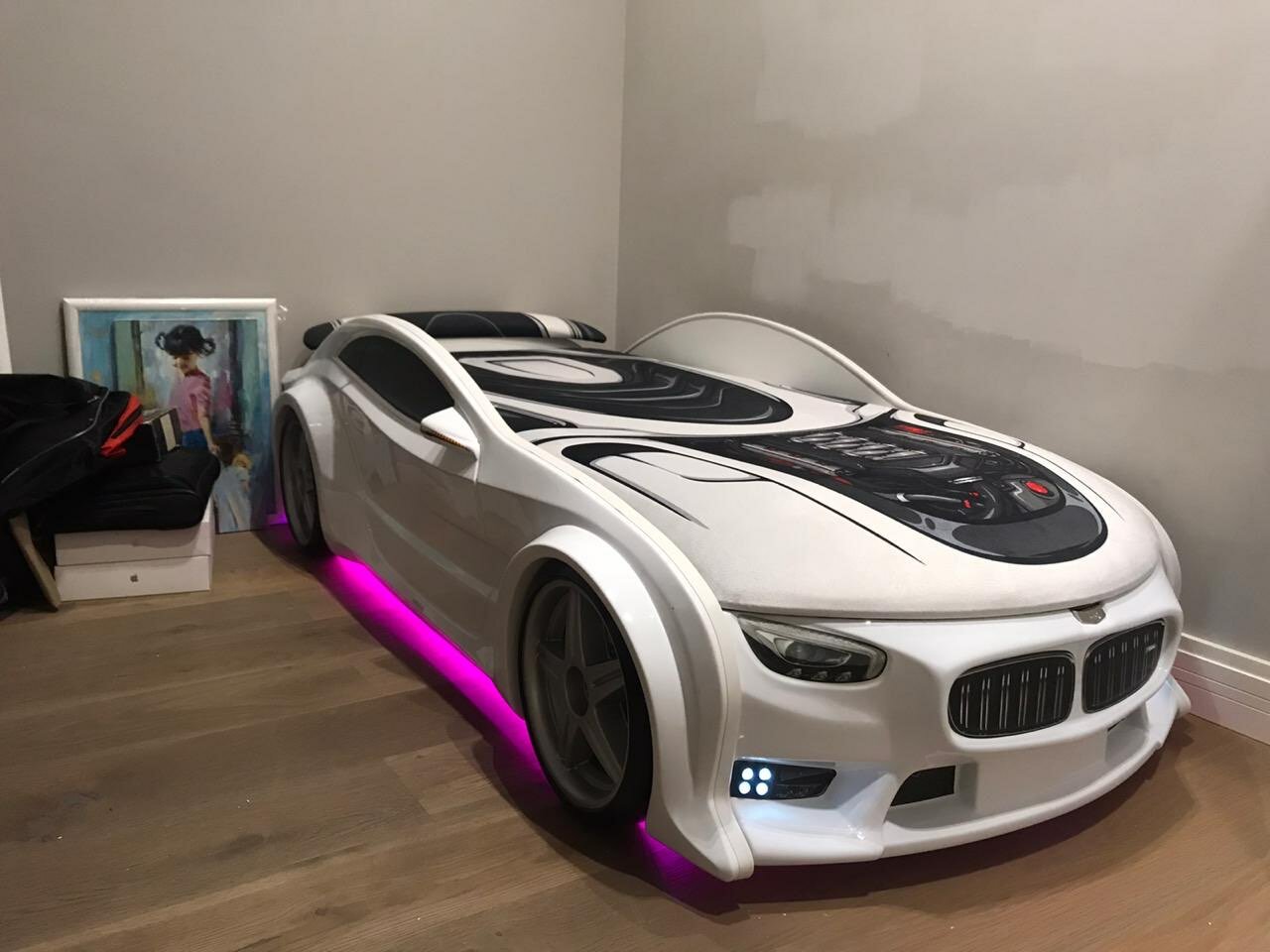 Кроватка Futuka Kids кровать-машина Neo БМВ белый цвет белый c подсветкой фар и дна, спойлером, матрас в дизайне "sport"