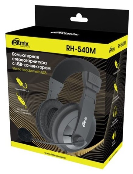Наушники с микрофоном Ritmix RH-540M USB звук чёрная компьютерная гарнитура, кабель 2 метра