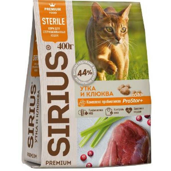 SIRIUS/Полнорационный сухой PREMIUM корм для стерилизованных кошек, Утка и клюква, 0.4 кг