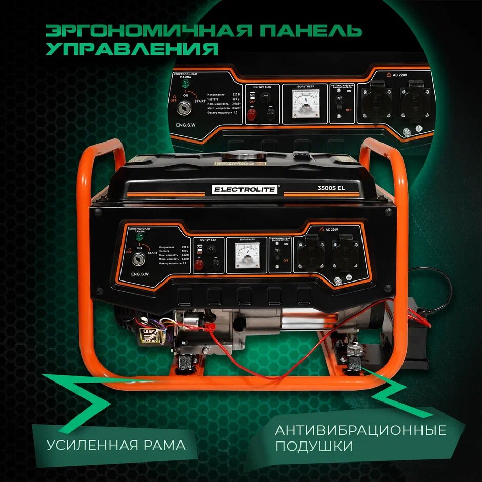 Electrolite Генератор бензиновый 3500S EL с электростартером ( 4.4 кВа максимальная нагрузка , 220 В / 12 В, 3 / 3,5 кВт, 7.5 л.с, электростартер + АКБ ) 5568 43 060 ₽ Подробнее