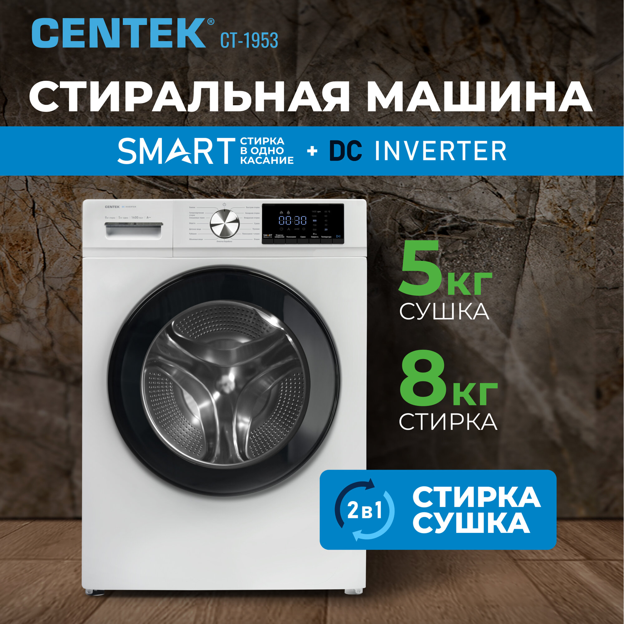 Стиральная машина автомат с сушкой CENTEK CT-1953: белая, узкая, 8кг/5кг, 16 программ, инверторный двигатель 52 453 ₽ Подробнее