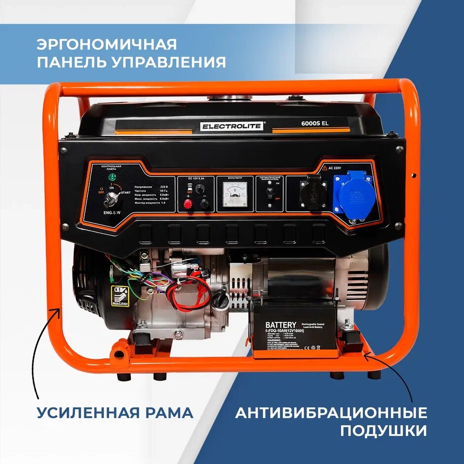 Генераторы Генератор бензиновый / электростанция / бензогенератор Electrolite 6000S EL медная обмотка ( 7.5 кВа пиковая нагрузка , 220 В / 12 В, 5 / 6 кВт, 50 Гц, 13 л.с, электростартер + АКБ ) генератор 5 кВт