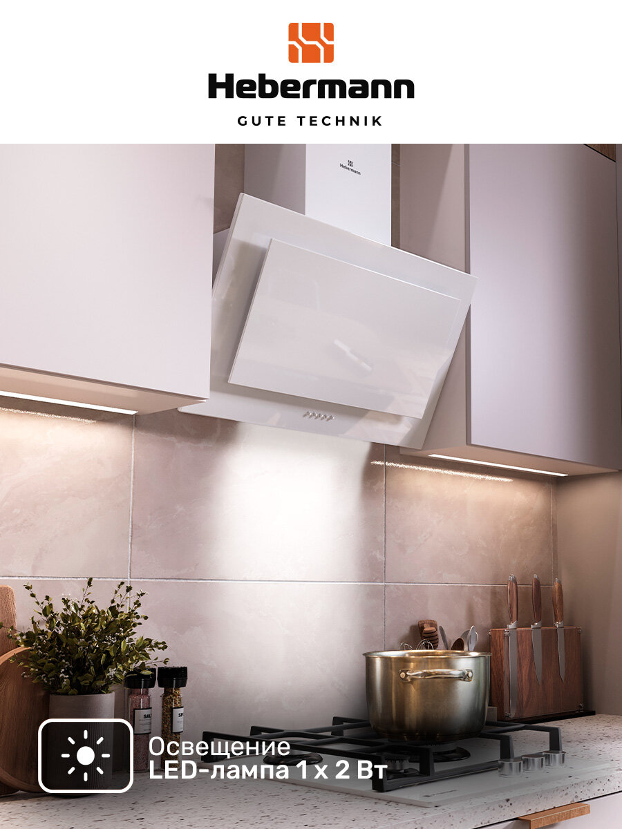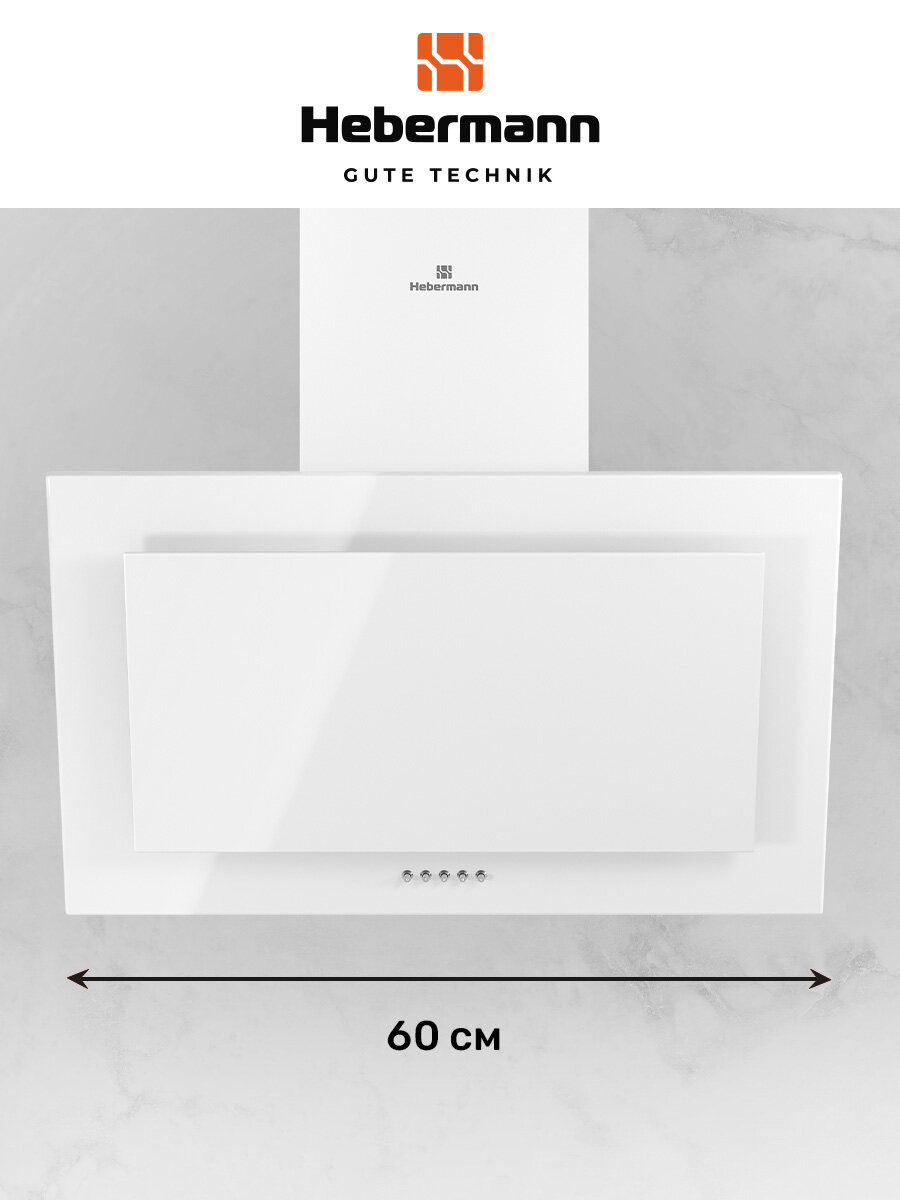 Вытяжки Наклонная кухонная вытяжка Hebermann HBKH 60.5 W, 60 см, белая, кнопочное управление, LED лампы, отделка- окрашенная сталь,стекло.
