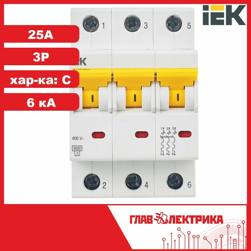 Выключатель автоматический модульный 3п C 25А 6кА ВА47-60M, IEK MVA31-3-025-C (1 шт.)