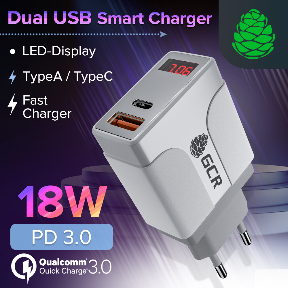 GCR Сетевое зарядное устройство на 2 USB порта (QC 3.0 + PD 3.0 ), белый
