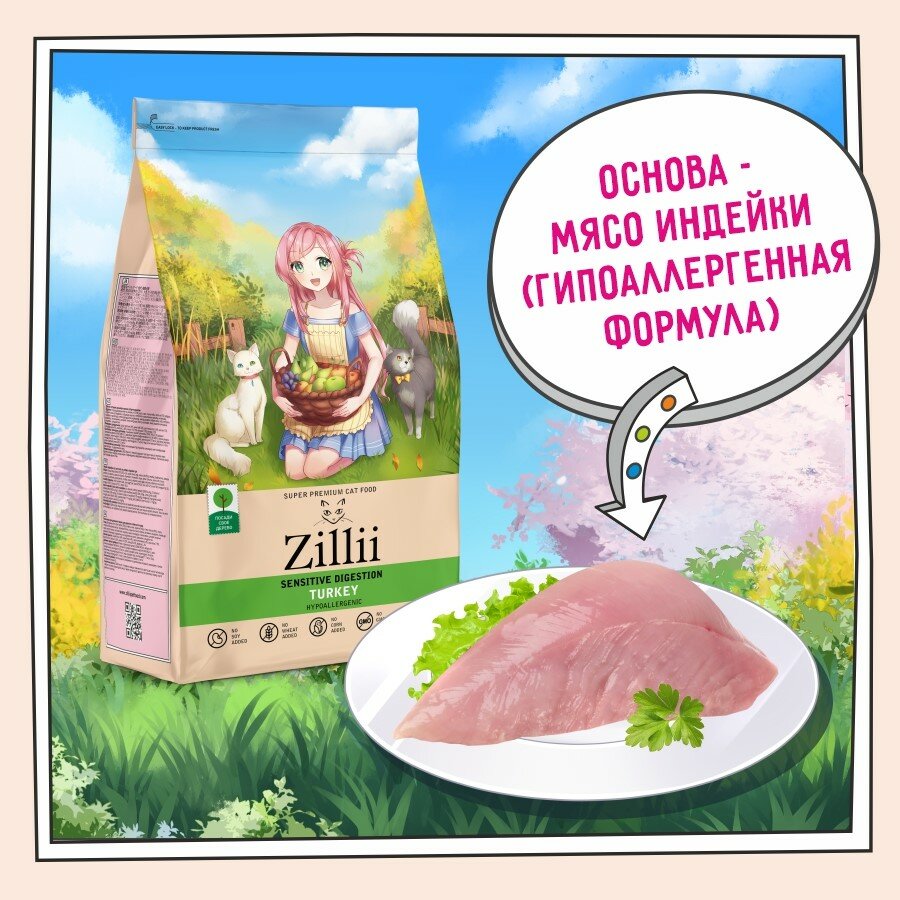 Корм для кошек Корм сухой для кошек с чувствительным пищеварением 2 кг, гипоаллергенный ZILLII (Зилли) Sensitive Digestion Cat, Индейка
