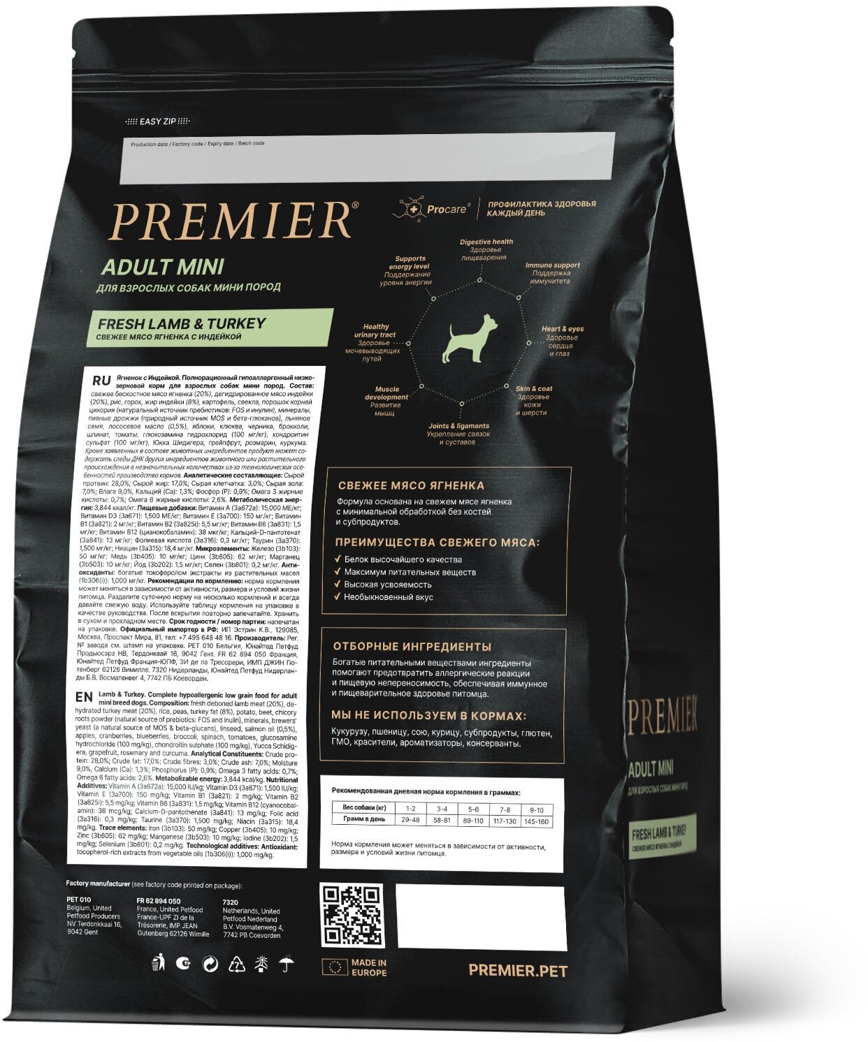 Premier сухой корм adult mini для взрослых собак мелких пород ягненок с индейкой, 1кг