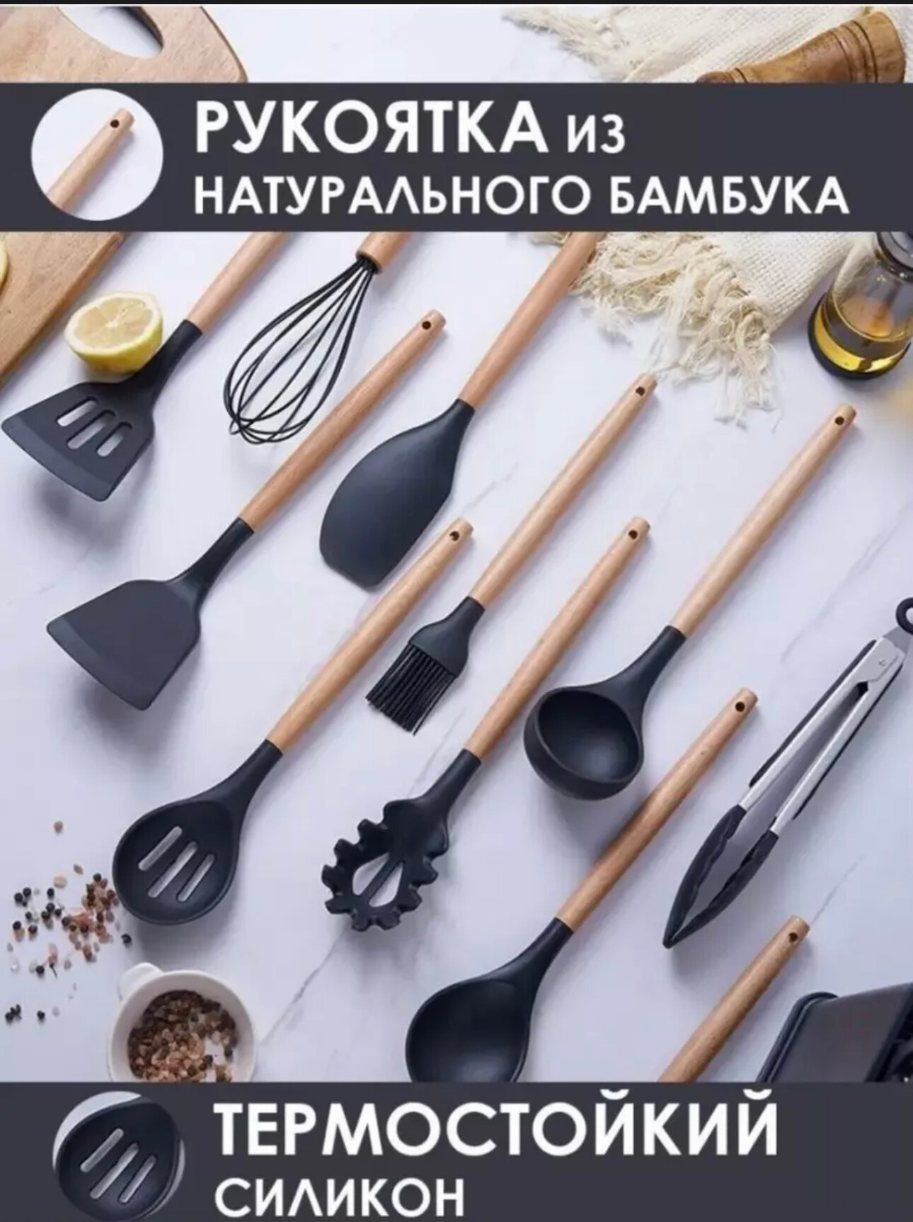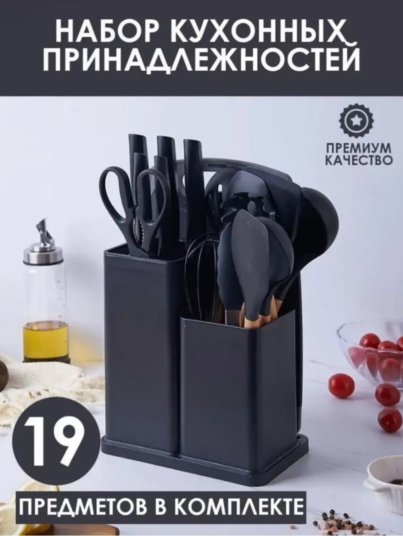 Кухонные ножи Набор кухонных принадлежностей kosmo. store, силиконовые приборы, ножи, набор ножей, кухонная навеска, 19 предметов, черный