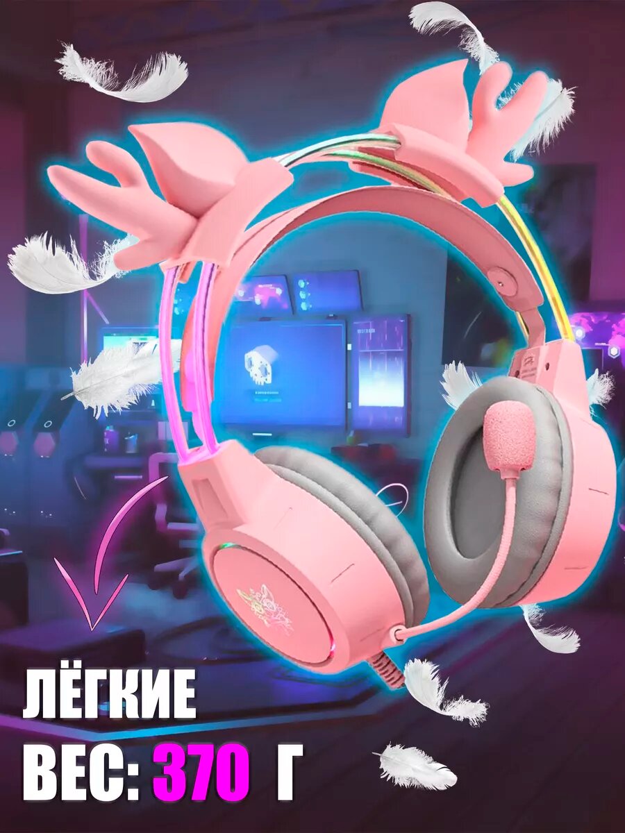 Наушники Игровые наушники ONIKUMA X15 pro Pink Star розовые с оленьими ушками и подсветкой