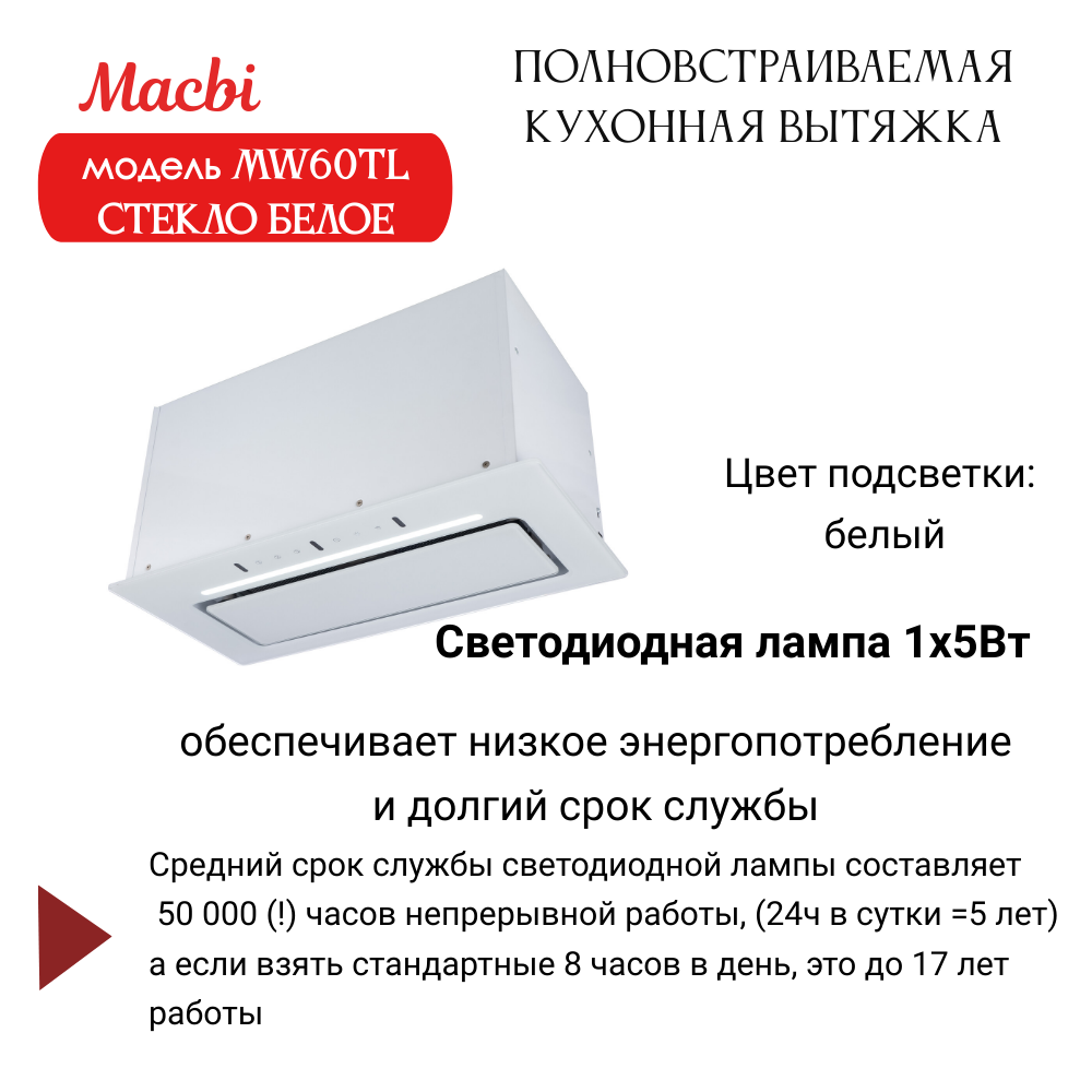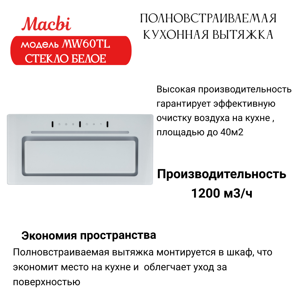 Вытяжки Вытяжка кухонная MACBI встраиваемая MW60TL WHITE 1200м3/ч Белая (управление жестами)