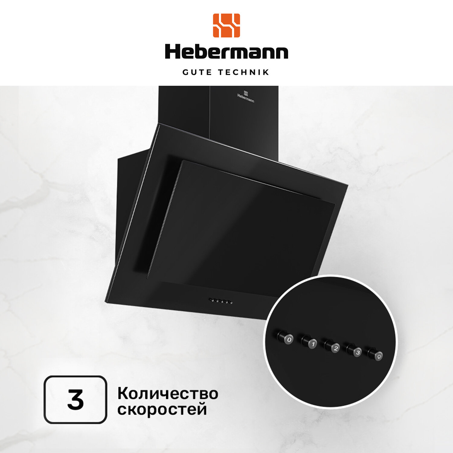 Вытяжки Наклонная кухонная вытяжка Hebermann HBKH 60.5 B, 60 см, черная, кнопочное управление, LED лампы, отделка- окрашенная сталь, стекло, производительность 700 м³/ч