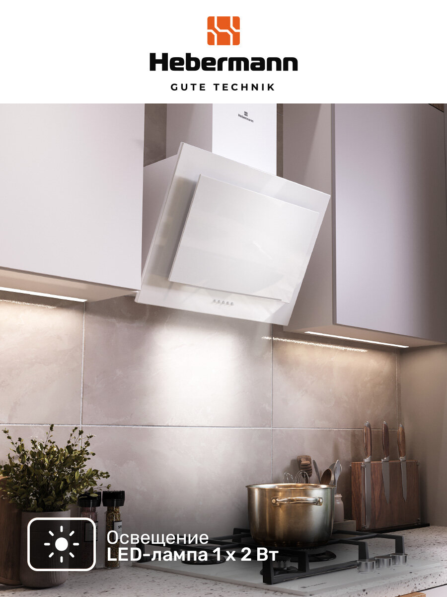Вытяжки Наклонная кухонная вытяжка Hebermann HBKH 50.4 W, 50см, белая, кнопочное управление, LED лампы, отделка- стекло.