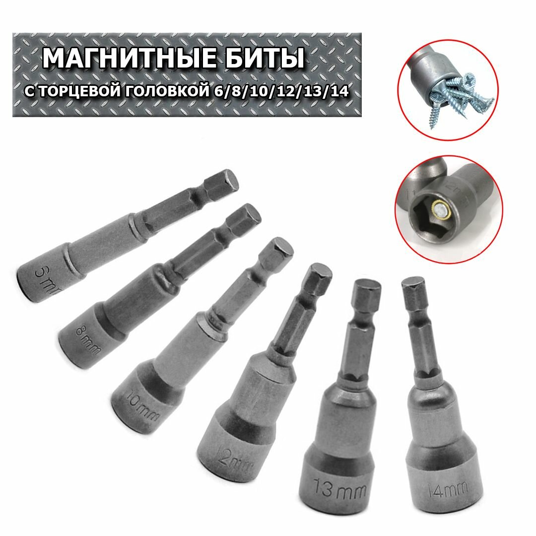 Биты и торцевые головки Магнитные биты с торцевой головкой 6/8/10/12/13/14 мм, набор из 6 штук