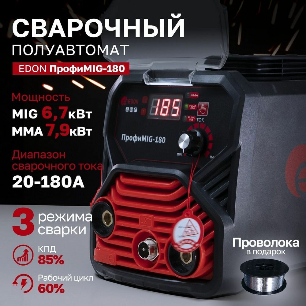 Сварочные аппараты Сварочный аппарат полуавтоматический Edon ПрофиMIG-180 MIG 6,7кВт 20-180А, MMA 7,9кВт 20-180А, раб.цикл 60%, КПД 85%, диаметр: электроды 2-4мм, проволока 0,8-1мм