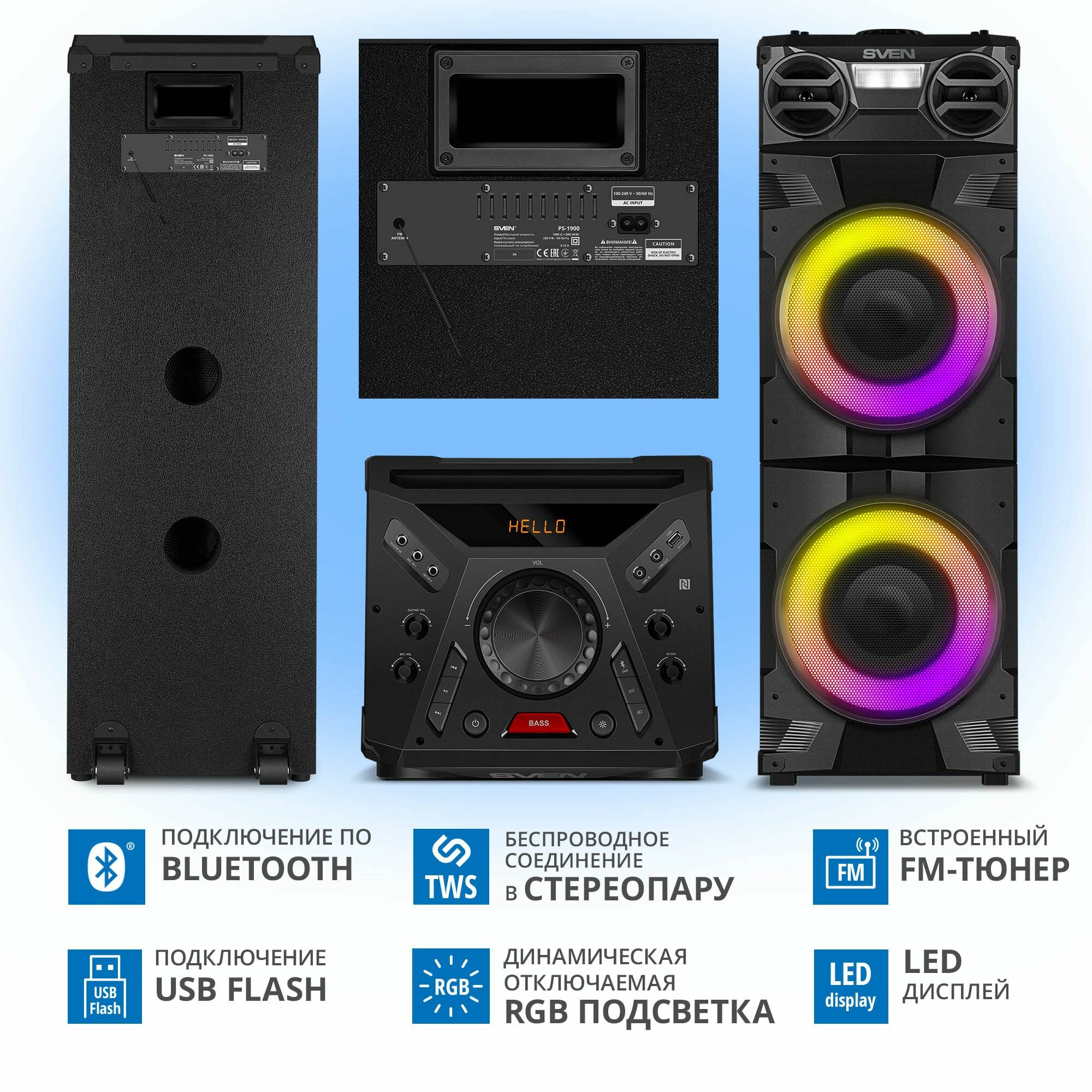 Аудиосистемы Колонка портативная беспроводная bluetooth SVEN PS-1900 / 1000 Вт / TWS / Bluetooth / FM / USB / LED-дисплей