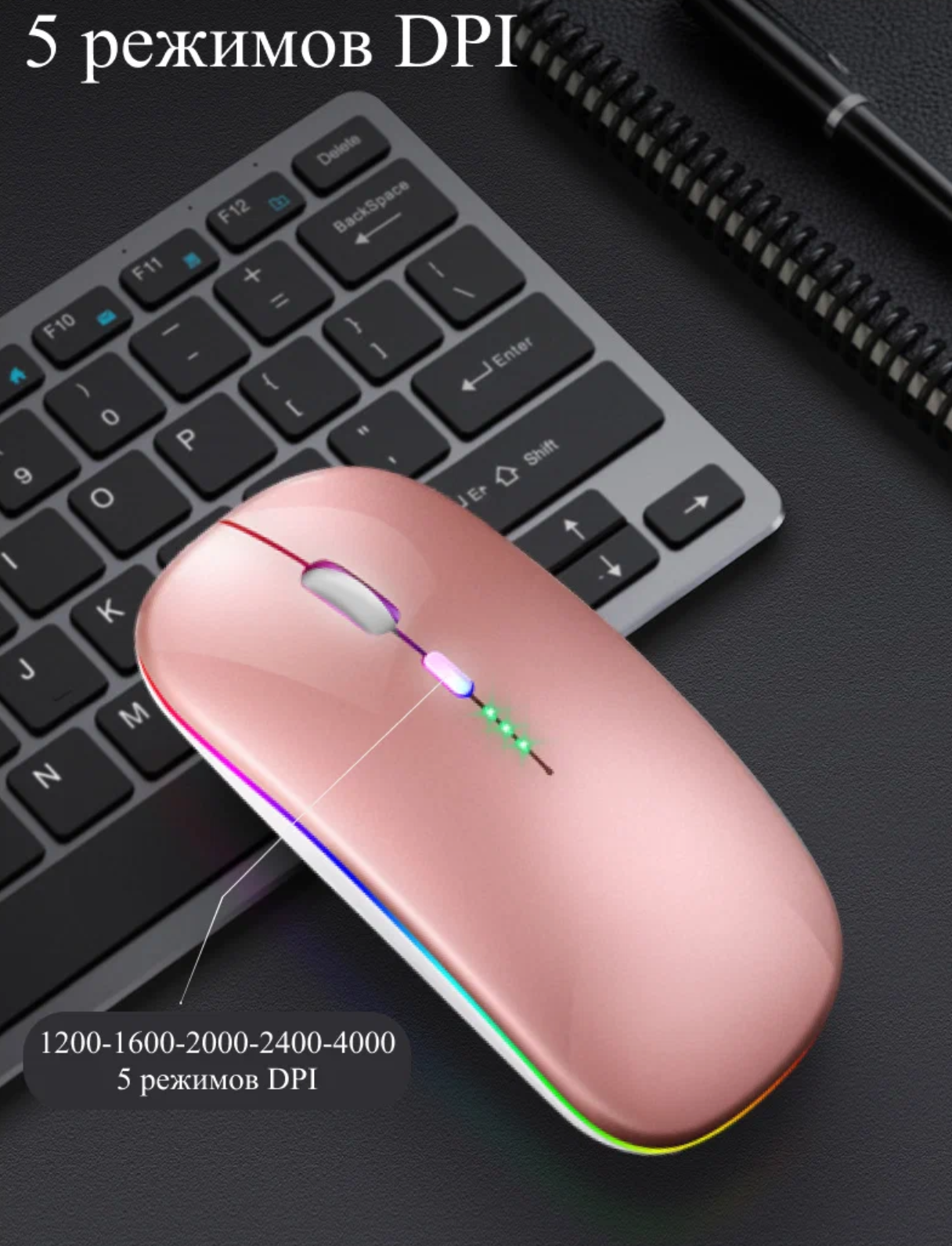 Мышки Мышь беспроводная компьютерная аккумуляторная / 3 режима DPI (800/1200/1600) Bluetooth + USB 2.4Ghz / RGB подсветка / Розовый