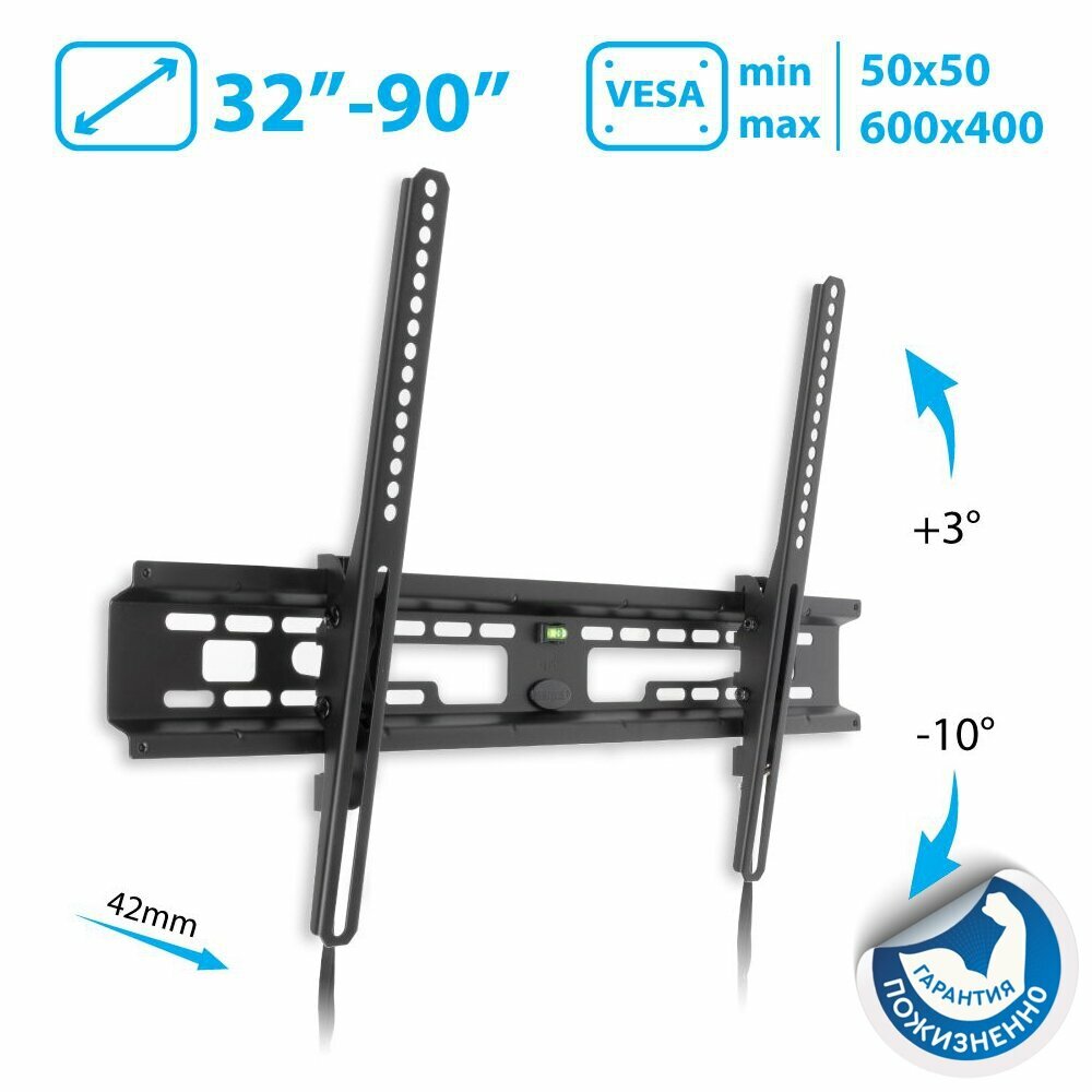 Kromax FLAT-2 new black, наст. для TV 32"-90", max 65 кг, 1 ст св., нак. +3°-10°, от ст. 42 мм, max VESA 600x400 мм.