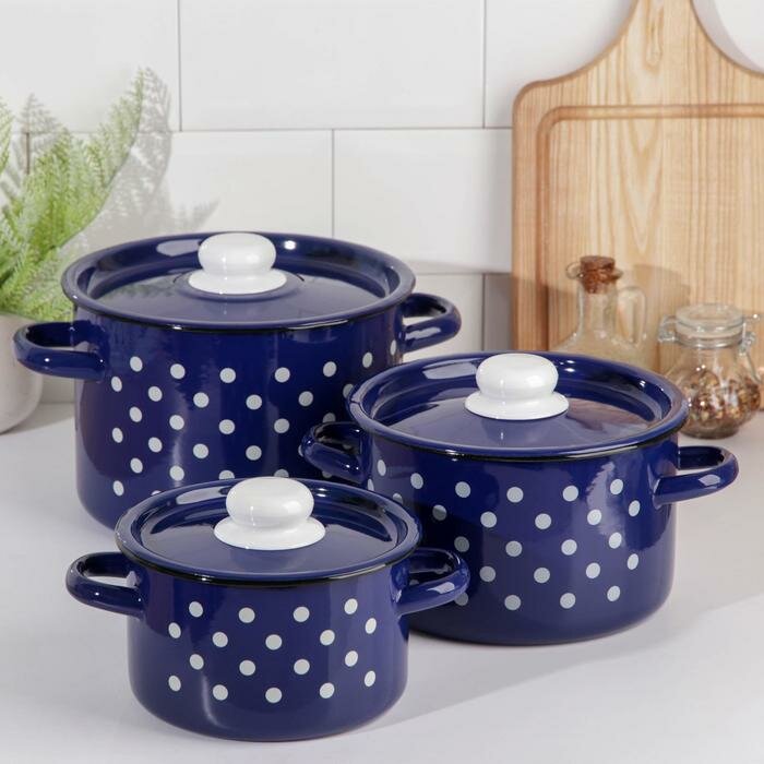 Кастрюля Стальэмаль Набор кастрюль «Белый горох», 3 предмета: 1,5 л, 2,9 л, 4,5 л, индукция, цвет синий