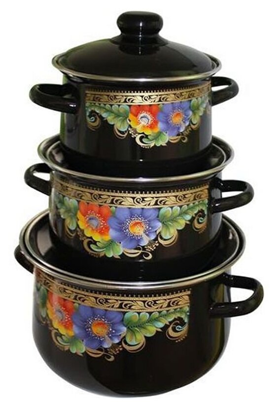 Набор посуды эмаль Стальэмаль "Жостово" 1С408, 3 предмета, 2л.; 4л.; 5,5л., крышка эмаль, ручки литые, с декором, черный