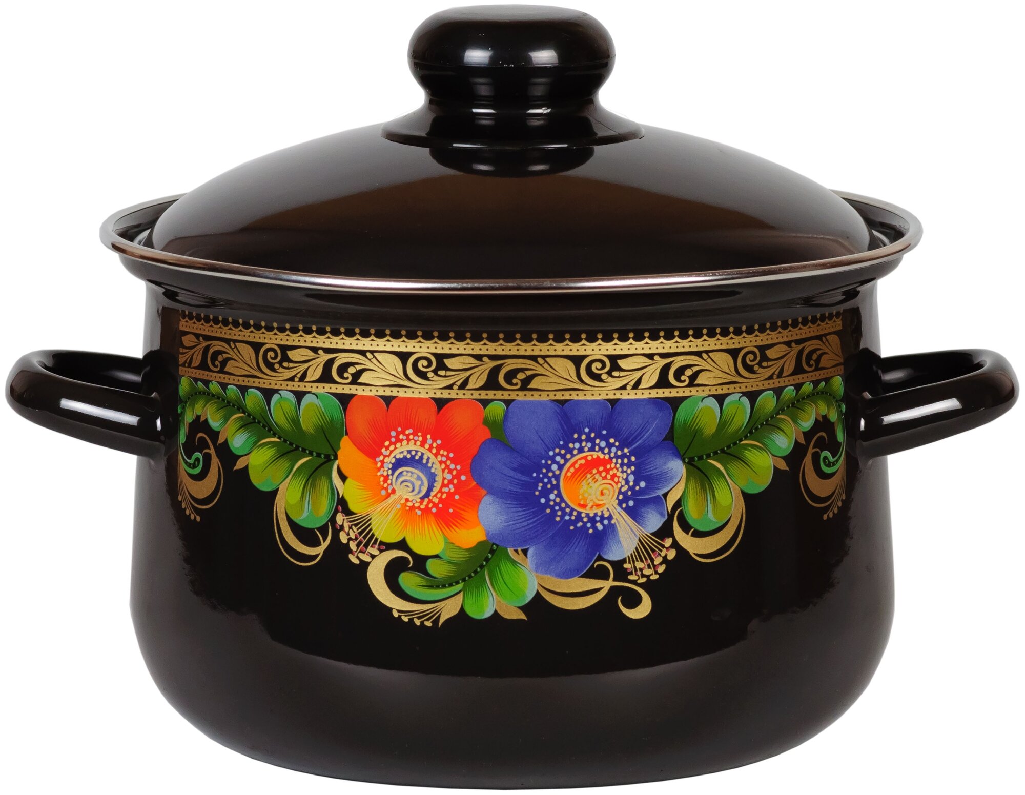 Набор посуды эмаль Стальэмаль "Жостово" 1С408, 3 предмета, 2л.; 4л.; 5,5л., крышка эмаль, ручки литые, с декором, черный