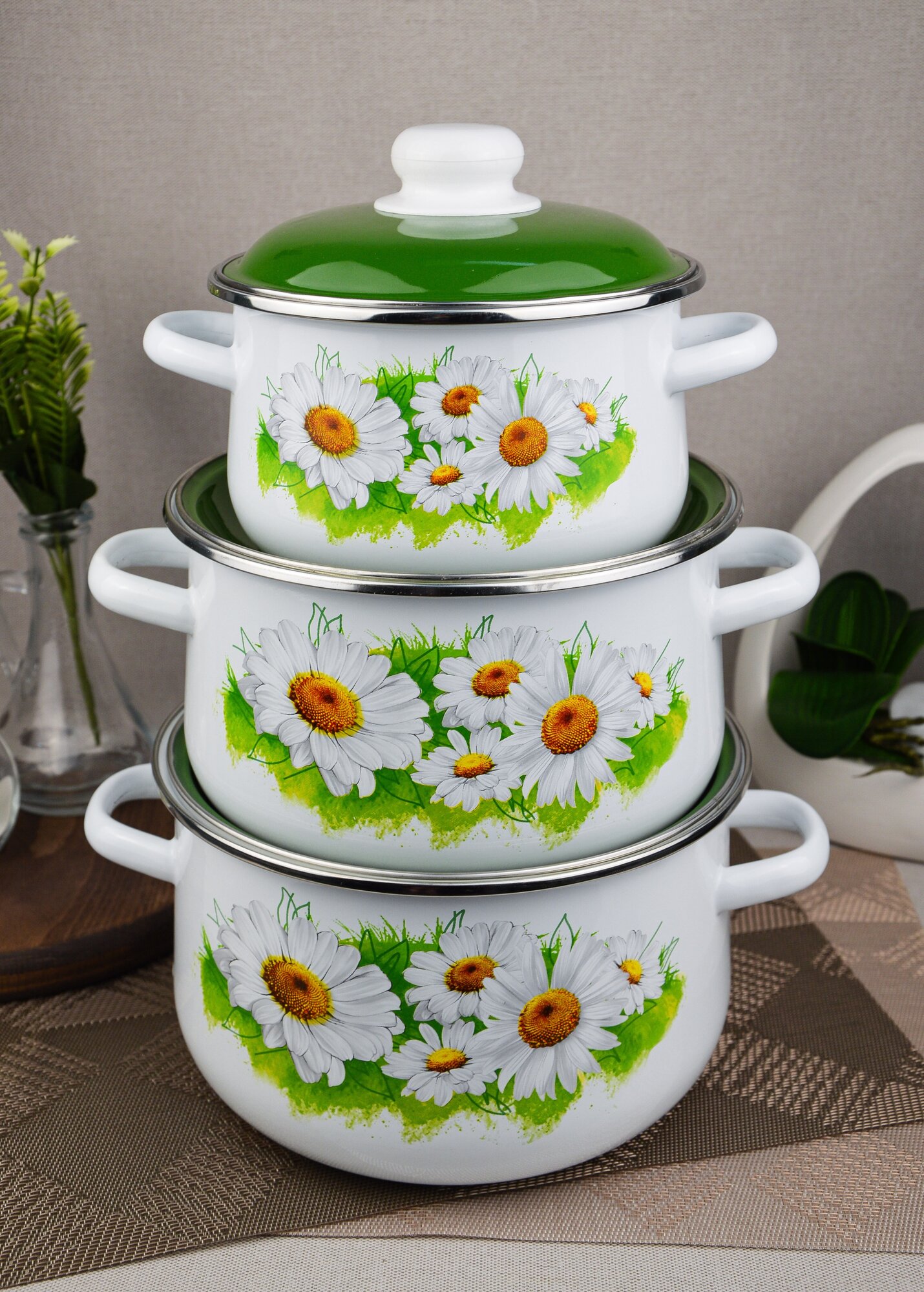 Набор эмалированной посуды 3 предмета "Ромашки-лето" белоснежный 2,0 л; 4,0 л; 5,5 л / набор кастрюль / набор кастрюль эмалированных