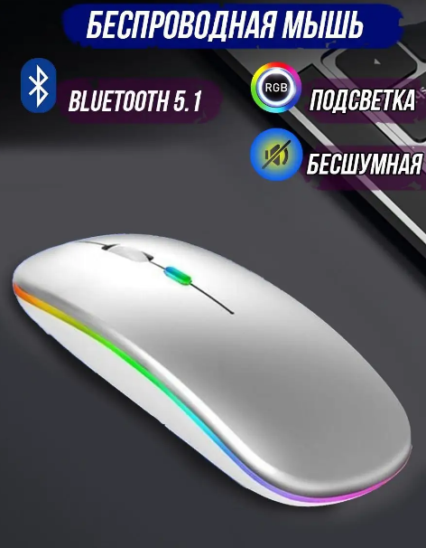 Мышки Беспроводная компьютерная мышь, ультратонкая/Бесшумная/RGB подсветка\Серебро