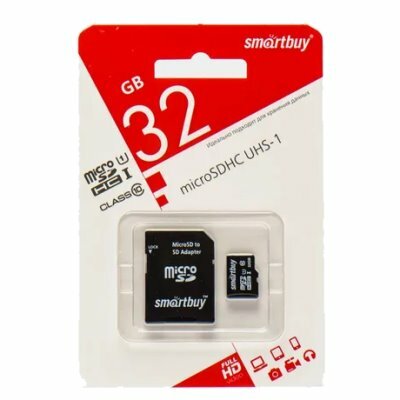Карта памяти micro SDHC, 32 GB, SMARTBUY, 10 Мб/сек. (class 10), с адаптером, SB32GBSDCL10-01