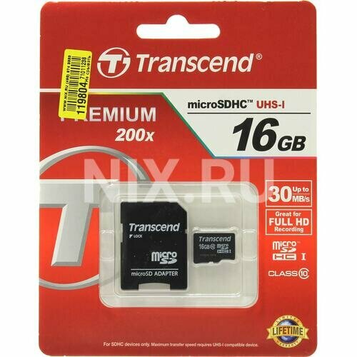 Карта памяти Карта памяти Transcend Premium microSDHC 16Gb UHS-I Cl10 +ад, TS16GUSDHC10