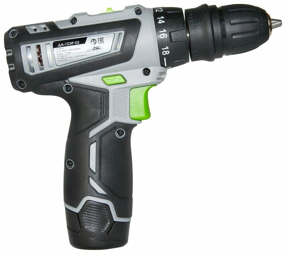 Аккумуляторная дрель-шуруповерт Интерскол ДА-12ЭР-02 Домашний мастер 28 Н·м серый/черный/зеленый