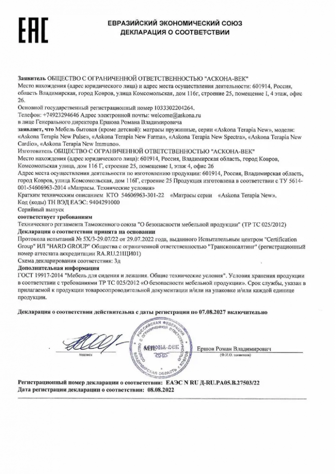 Матрас Аскона Terapia Cardio 140x200 16 359 ₽ Подробнее