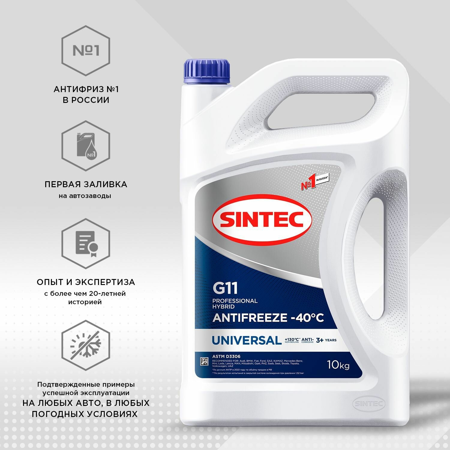 SINTEC UNIVERSAL G11 -40 гибридный силикатный антифриз 10кг для двигателя автомобиля, охлаждающая жидкость синтек в авто, синий, готовый к применению 2 179 ₽ Подробнее