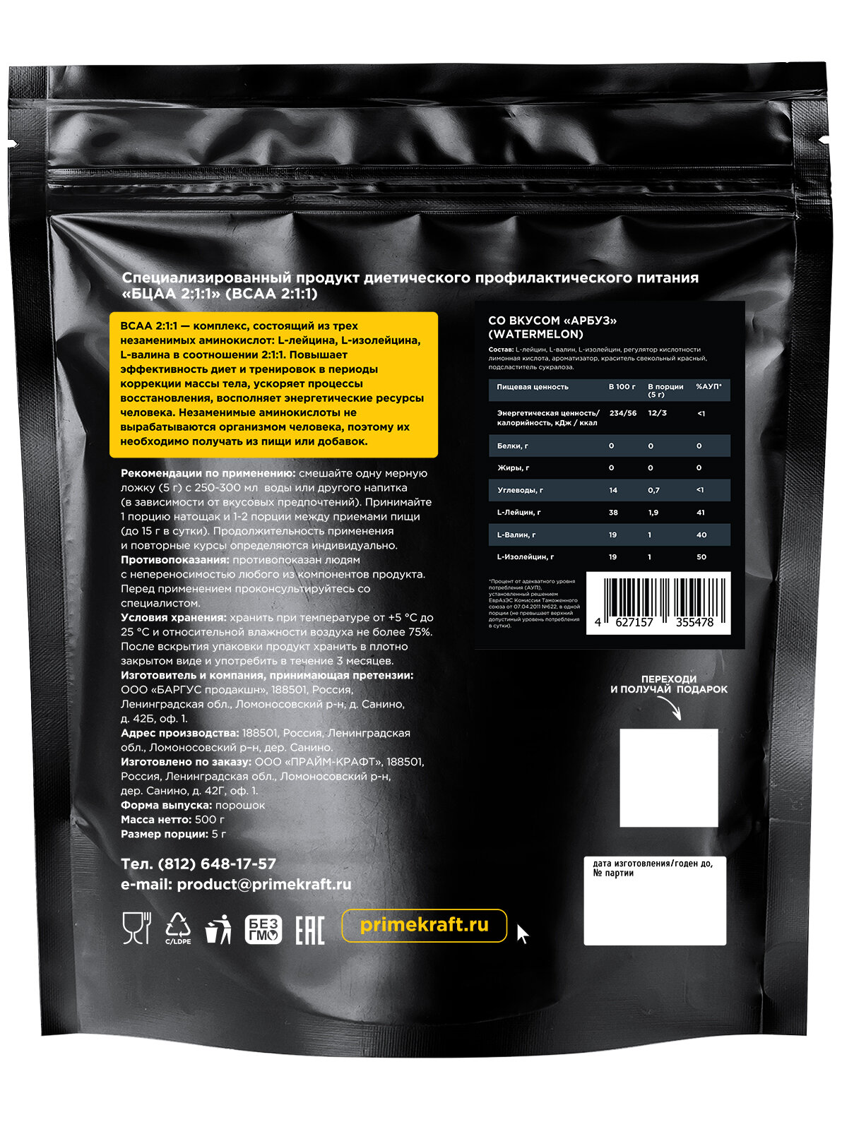 Аминокислоты Аминокислоты PRIMEKRAFT BCAA 2:1:1 (БЦАА) Арбуз, 500 г / 100 порций