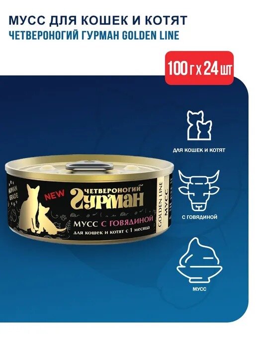 Корм консервированный для кошек и котят Четвероногий Гурман "Golden line Мусс Говядина", 100 г х 24 шт.