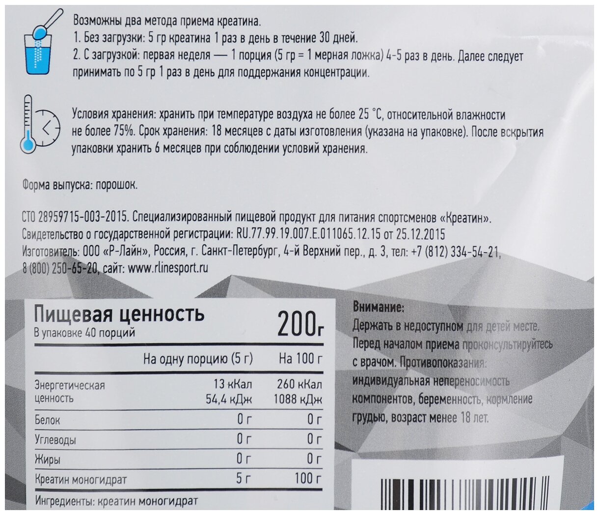 Креатин моногидрат Rline Creatine Simple, порошок, дой-пак 200 г