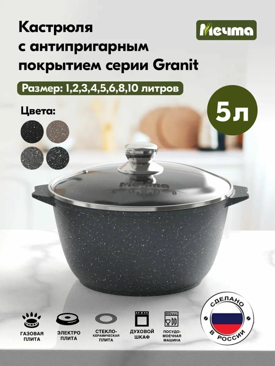 Мечта Кастрюля Гранит Star, 5 л, стеклянная крышка, антипригарное покрытие