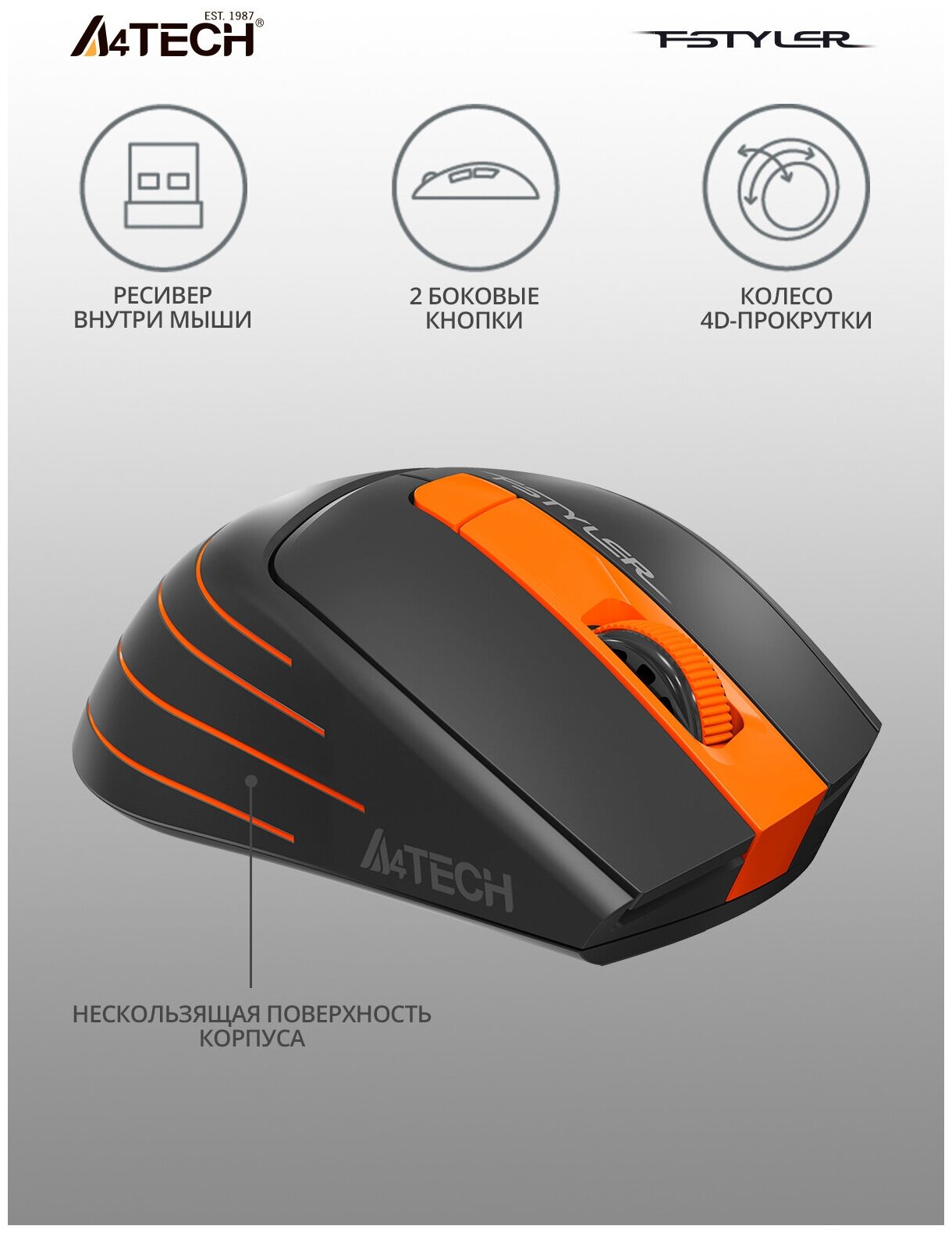 Компьютерная мышь A4Tech "Fstyler", беспроводная, 2000 dpi, серо-оранжевая (FG30)