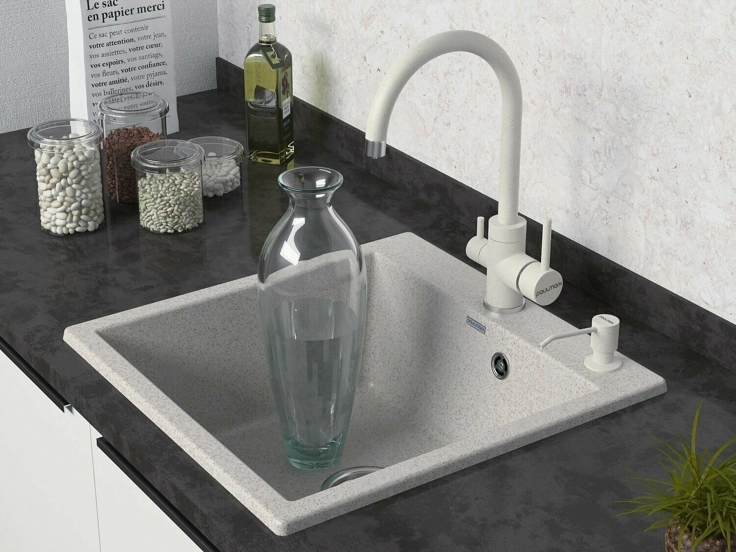 Кухонный смеситель Paulmark ESSEN, подключение к фильтру питьевой воды с отдельным каналом и выпуском, высокий поворотный излив, латунь, на мойку / столешницу, белый с вкраплениями, Es213211-331 16 500 ₽ Подробнее
