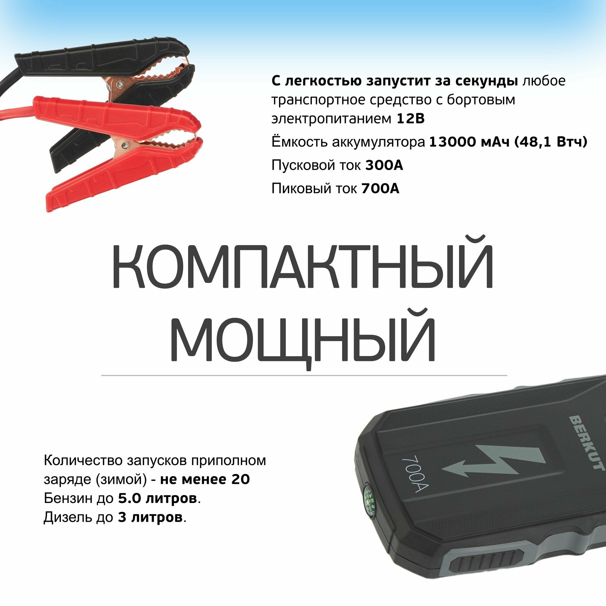 Устройство зарядно-пусковое автономное (бустер) BERKUT JSL-15000 12В, 300А, пиковый ток 700А, Li-Po 3200 мАч х 4 (4 Cell электротовар