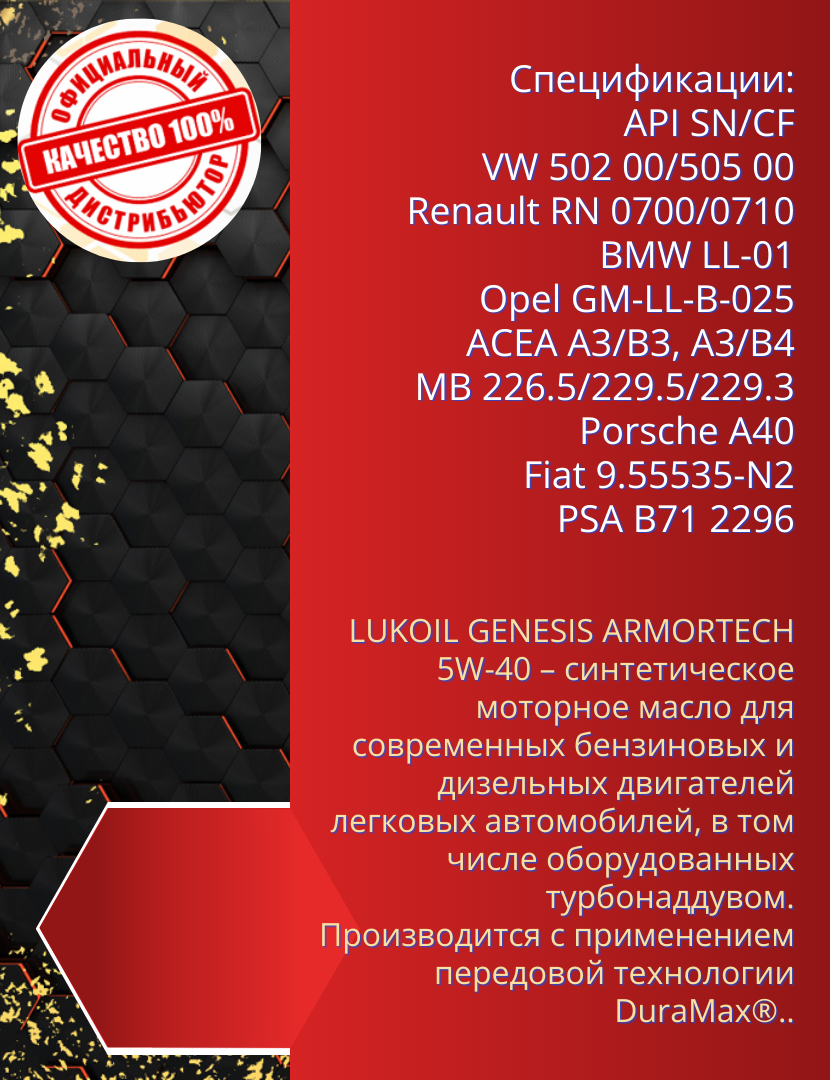 LUKOIL 3148670 ЛУКОЙЛ GENESIS ARMORTECH 5W40 (1L)_масло моторное! синт.\ SN, 502 00/505 00, 226.5/229.5, 0700/0710 1шт
