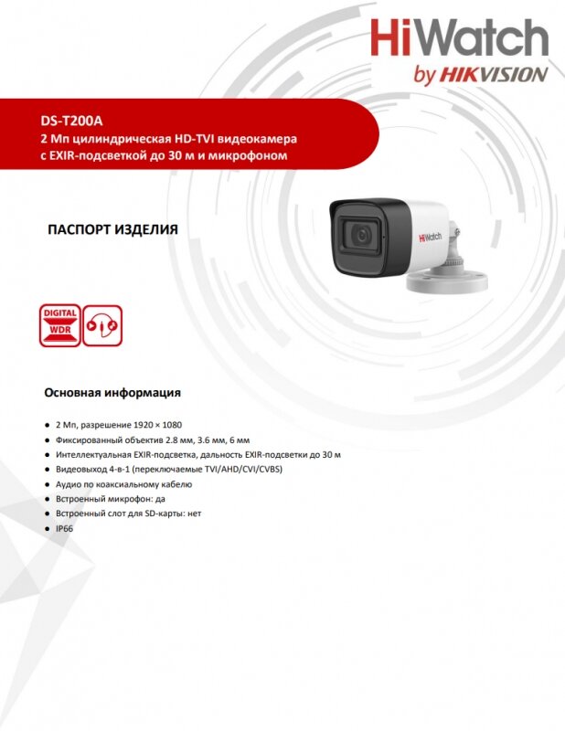 2 Мп уличная цилиндрическая HD-TVI камера HiWatch DS-T200A 2.8mm серии Value с встроенным микрофоном и EXIR-подсветкой до 30м