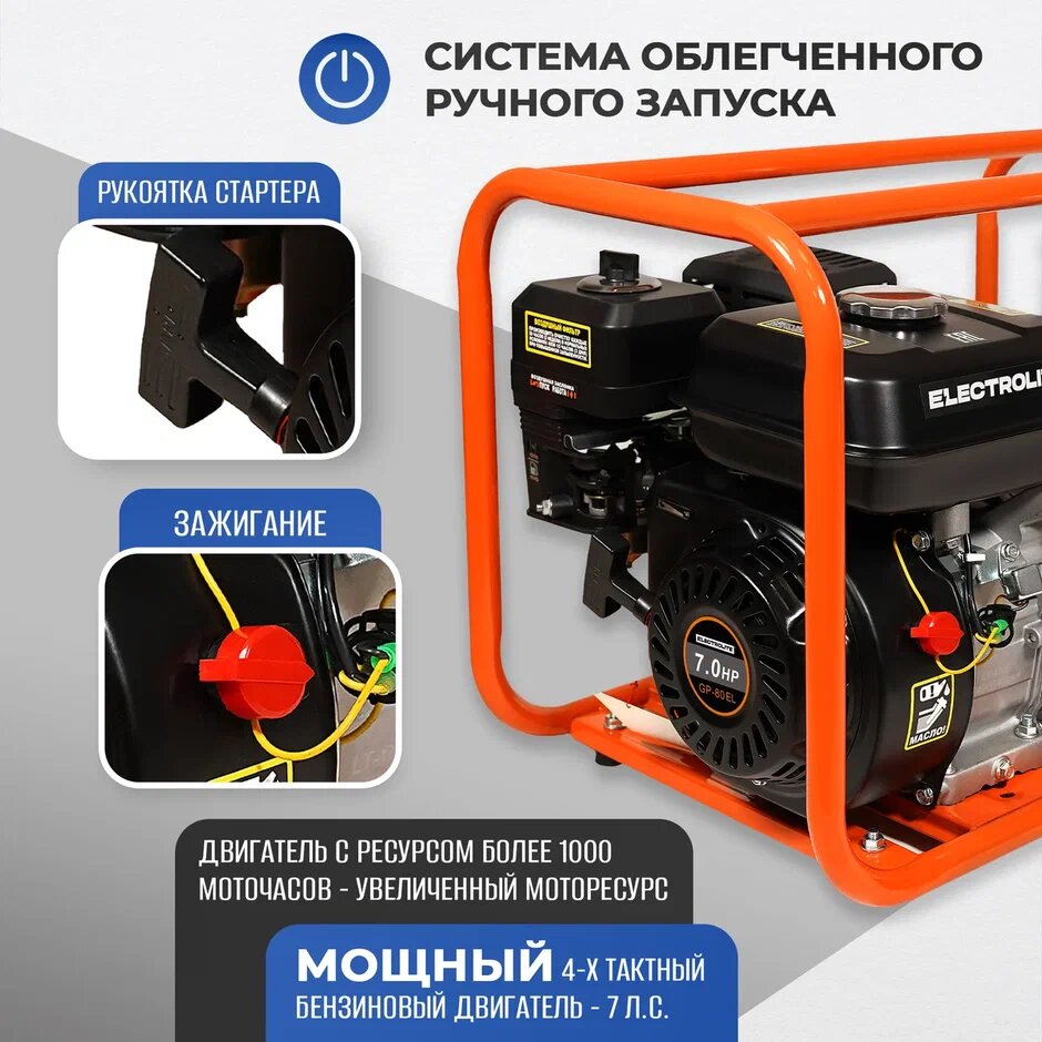 Мотопомпы Мотопомпа / Мотопомпа бензиновая / Мотопомпа бензиновая для воды / Помпа бензиновая для откачки воды ELECTROLITE GP-80EL ( 7 л.с, 1000 л/мин, 80 мм, для среднезагрязненной воды )