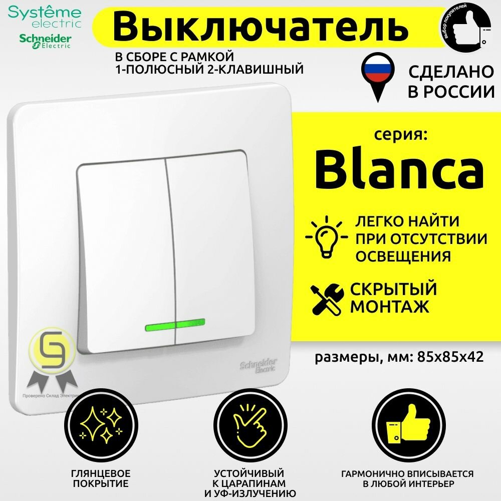 Выключатели Выключатель Blanca 1шт 10А 250B двухклавишный с подсветкой Schneider Electric/Systeme Electric в сборе с рамкой скрытый монтаж белый BLNVS010511
