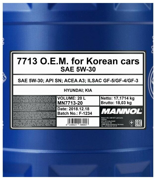 MANNOL 7713-20 Mannol For Korean Cars 5W-30 20 Л. Синтетическое Моторное Масло 5W30