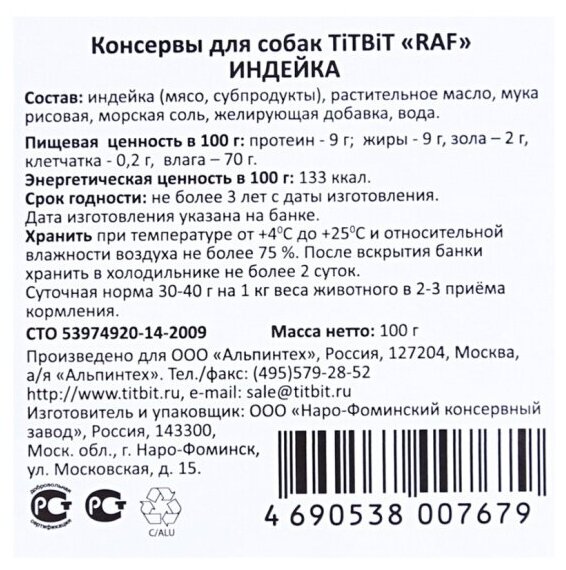 TiTBiT Паштет для собак RAF с индейкой (7679) 0,1 кг 40629 (18 шт)
