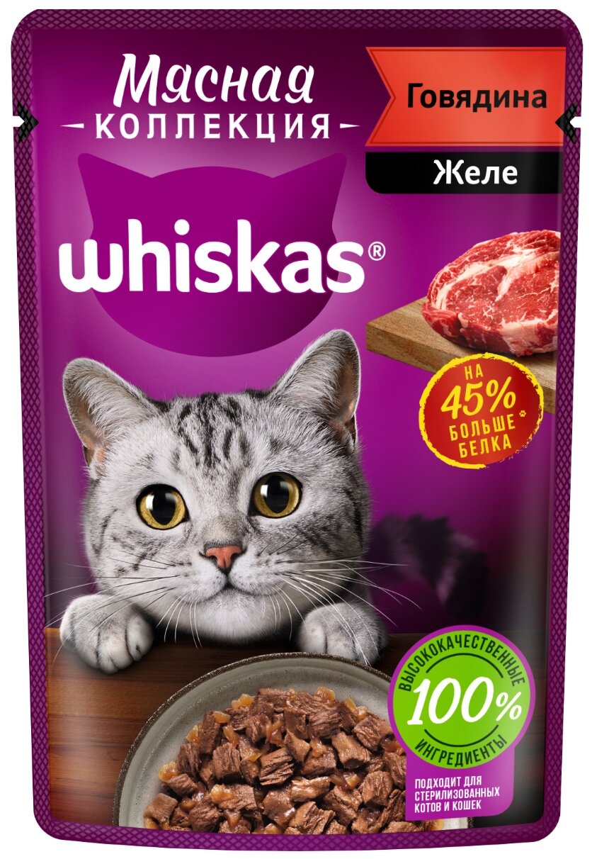 Набор Влажных Кормов Для Кошек WHISKAS Три Вкуса Желе И "Мясная коллекция" 42шт х 75г