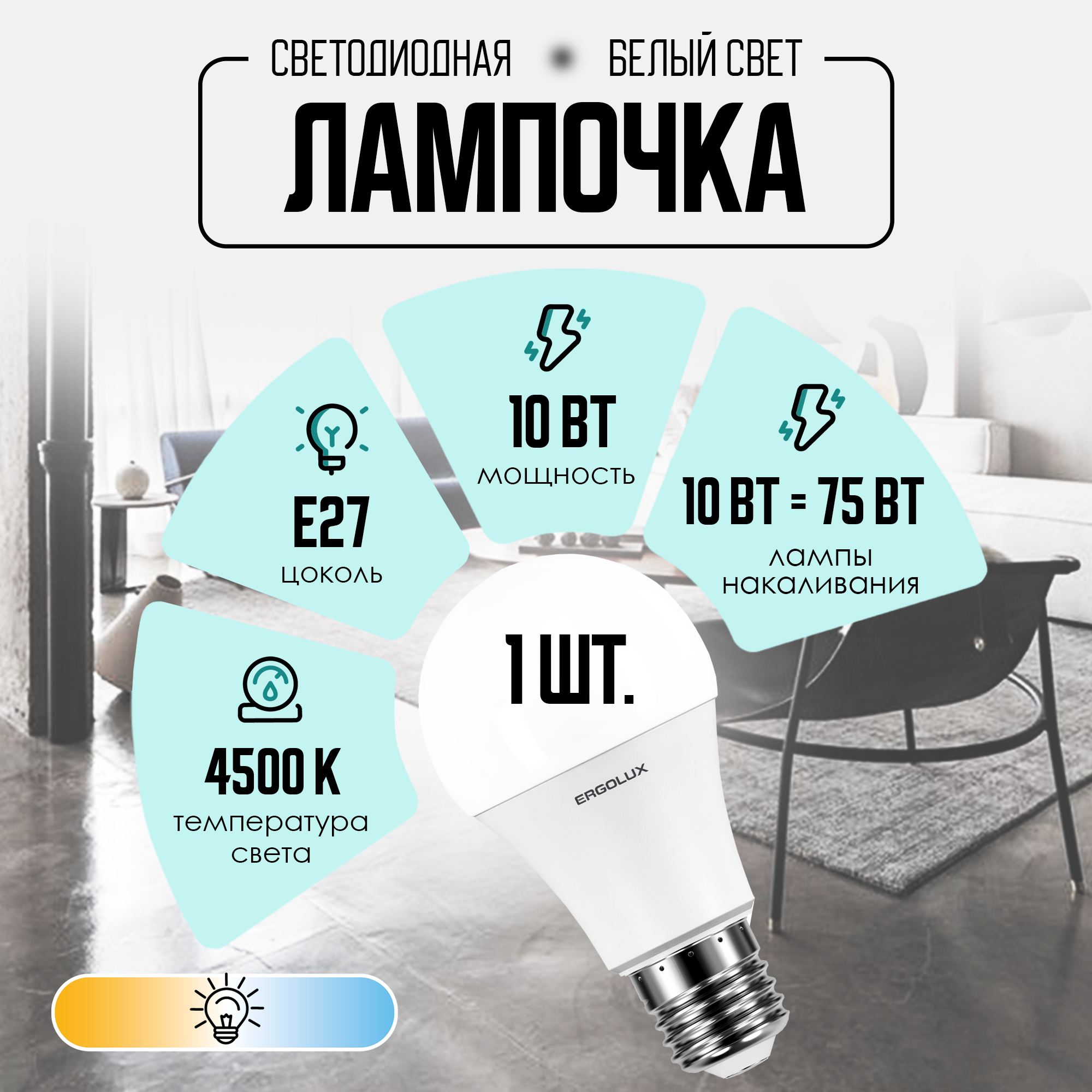 Лампа светодиодная E27, 10 Вт, 80 Вт, груша, 4500 К, свет холодный белый, Ergolux