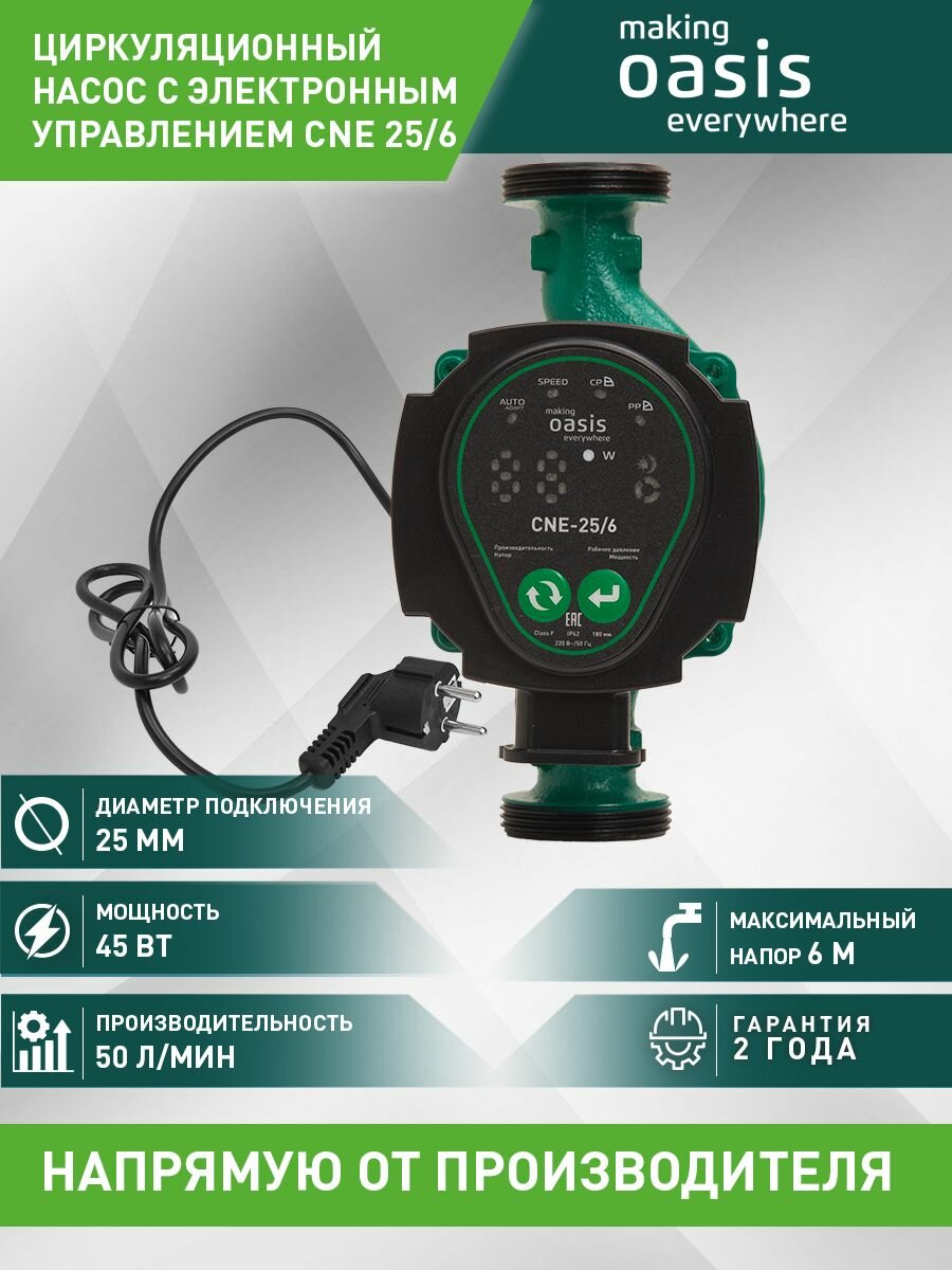 Насос циркуляционный для отопления с импульсным управлением Oasis CNE-25/6, 45 Вт, напор 6 м, 50 л/мин