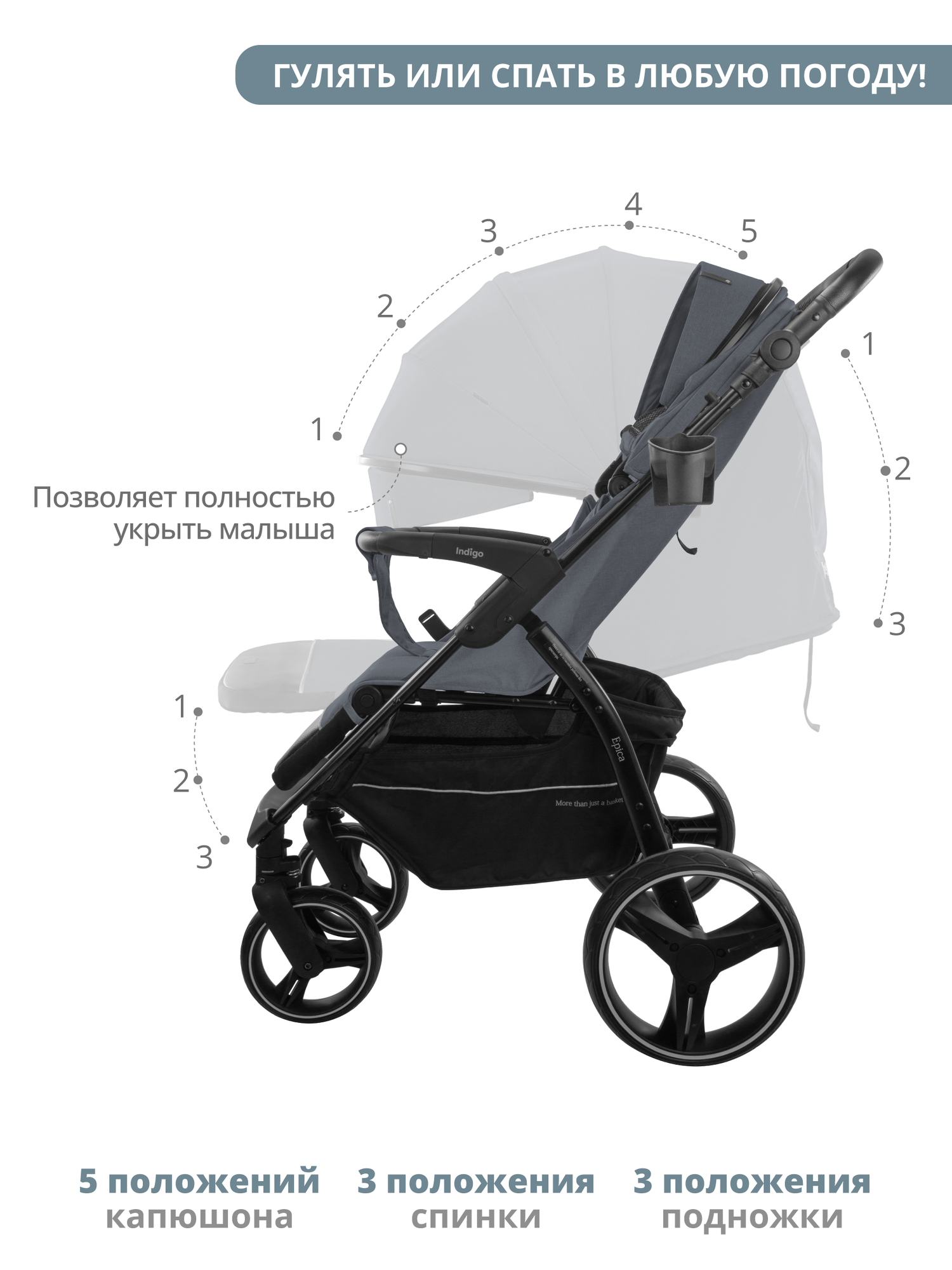 Коляска прогулочная детская Indigo EPICA XL с большими колесами всесезонная складная, синий 14 999 ₽ Подробнее