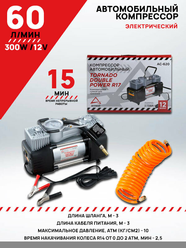 Компрессор автомобильный 10 атм 60 л/м 300вт 25а двухцилиндровый arnezi tornado ac620 double power 3 140 ₽ Подробнее